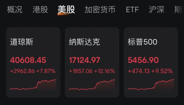 纳斯达克指数涨超12%,标普500指数涨9.5%,道琼斯工业指数涨近8%。美国科技七巨头指数涨13.94%,特斯拉涨超22%,英伟达涨超18%,苹果涨逾15%。